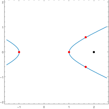 We take \(f(x,y) = (x - 2)^2 + y^2\) (since the square of a function inherits critical points), \(g(x,y) = x^2 - 5 y^2\), and \(c = 1\), which gives the stationary points \((-1, 0, 3), (1, 0, -1), (\tfrac{5}{3}, -\tfrac{4}{3\sqrt{5}}, -\frac{1}{5}), (\tfrac{5}{3}, \tfrac{4}{3\sqrt{5}}, -\frac{1}{5})\). The last two give minima (\(f=\frac{7}{15}\)), and all are visualized below in red: