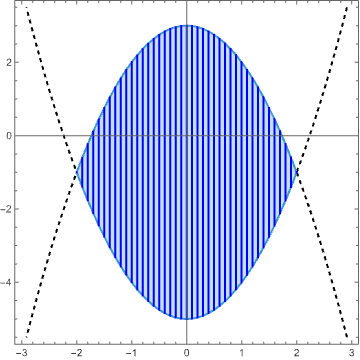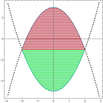 The integral, which works out to \(0\) volume, can be evaluated in two ways: \[ \begin{split} \iint_R x(y-1) \, dA & = \int_{-2}^2 \int_{x^2-5}^{3-x^2} x(y-1) \, dy \, dx \\ & = \int_{-1}^3 \int_{-\sqrt{3-y}}^{\sqrt{3-y}} x(y-1) \, dx \, dy + \int_{-5}^{-1} \int_{-\sqrt{y-5}}^{\sqrt{y-5}} x (y-1) \, dx \, dy. \end{split} \]