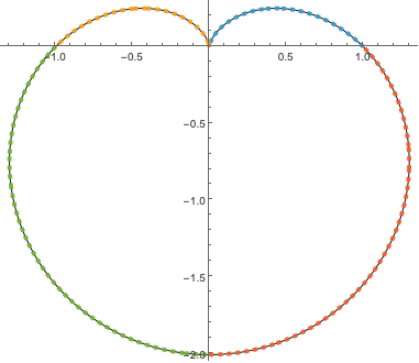 This curve is called a cardioid. In Cartesian coordinates, the cardioid is much more complicated—the implicit equation for the above curve is \((x^2 + y^2)^2 + 2 y (x^2 + y^2) = x^2.\)