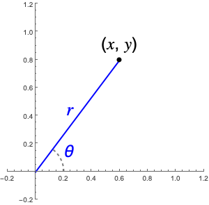- \(r\) measures the distance between a point and the origin, so we have \[ r = \sqrt{x^2 + y^2}. \]