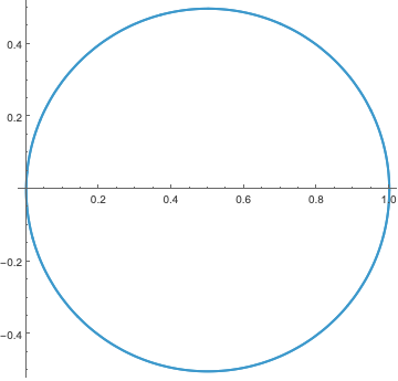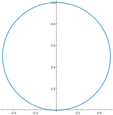 We have already seen that this is a circle of constant radius \(1\); as \(\theta\) varies, we trace out the circle once. Compare this with what it takes to specify the circle in Cartesian coordinates, where we have to write \(y = \sqrt{1-x^2}\) and \(y = -\sqrt{1-x^2}\) to define the top and bottom halves (note that \(x\) varies from \(-1\) to \(1\)).