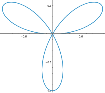The circle along the \(x\)-axis is \(r = \cos \theta\), while the circle on the \(y\)-axis is \(r = \sin \theta\). Why does the rose curve corresponding to \(r = \sin 3 \theta\) only appear to have three petals, while the one corresponding to \(r =\cos 2 \theta\) has four?
